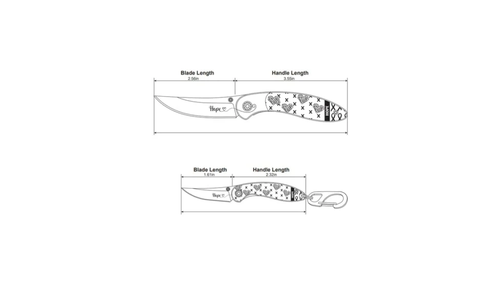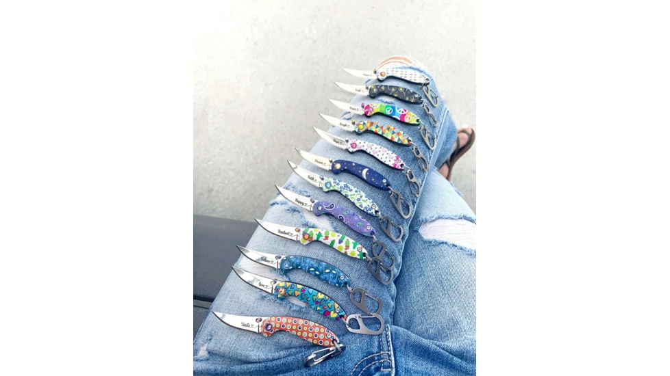 Brighten Blades Believe Keychain is the perfect everyday carry knife for women. The small keychain knife is no larger than a key fob, and doesn’t take up space in your purse, pocket, or bag. The jeweled thumb stud and rotator add a touch of elegance. Each knife has a positive word engraved on the mirror polished stainless steel blade. The fun colorful pattern on the handle puts a smile on the user’s face. The carabiner type clip makes it easy to attach to your keys, backpack, cell phone case, etc.. These knives are perfect to open Amazon boxes, cut off tags, peel an apple, open a package of licorice, all of the many tasks you perform daily. Brighten Blades makes the perfect gift for girls going off to college, for busy moms, and for anyone needing to open packages and boxes. Let Brighten Blades brighten your day!![]()