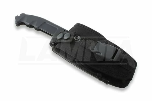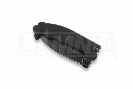 The blade, because of itâs weight, itâs a real guillotine. The extra safe device is a steel pin to be hand screwed through two holes placed by the guard zone of the massive anticorodal aluminum alloy handle. This device is necessary because of the violence of the chopping performances expressed this uncommon folder.