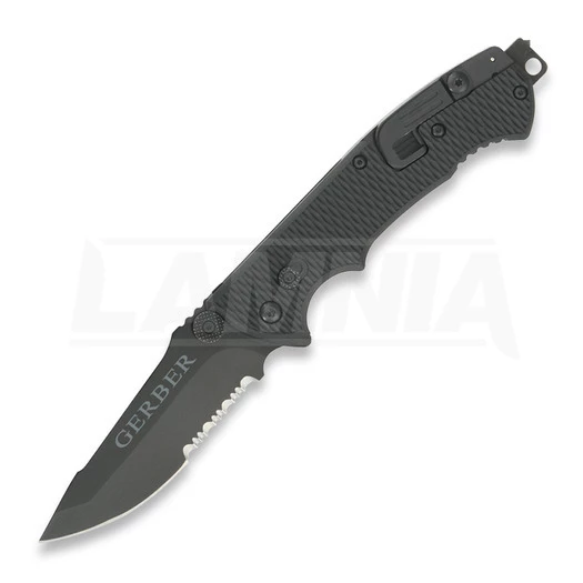 (Combat Life Saver). 5 1/8″ closed linerlock. Black finish 440A stainless partially serrated clip point blade with oversized dual thumb studs. Textured black glass filled nylon handles with integrated glass breaker, seat belt cutter and oxygen tank valve opener.