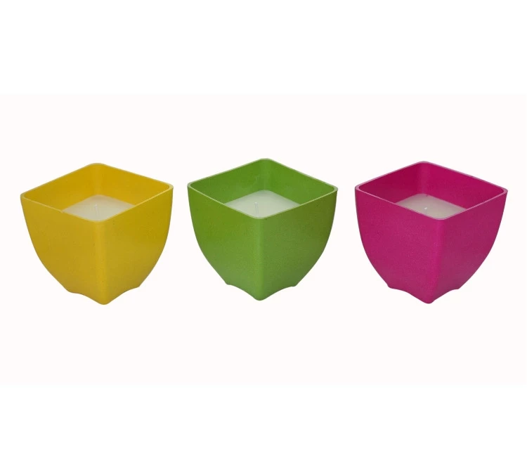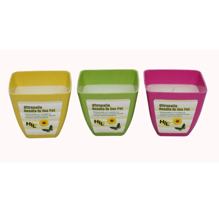 Citronella Eco Pot. Practical and environmentally friendly, this eco pot is made from biodegradeable bamboo and plant materials so it decomposes safely after the candle has been burned. Available in bright vibrant colours, pink, yellow and green, these candles make a festive display for any outdoor party or barbecue.