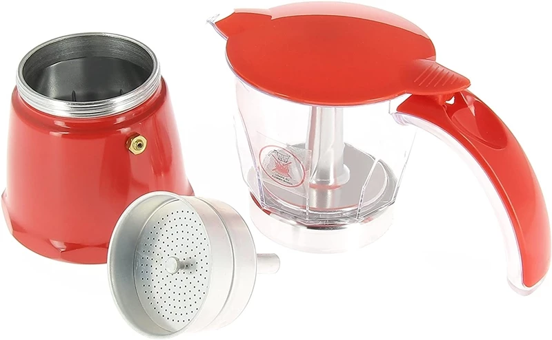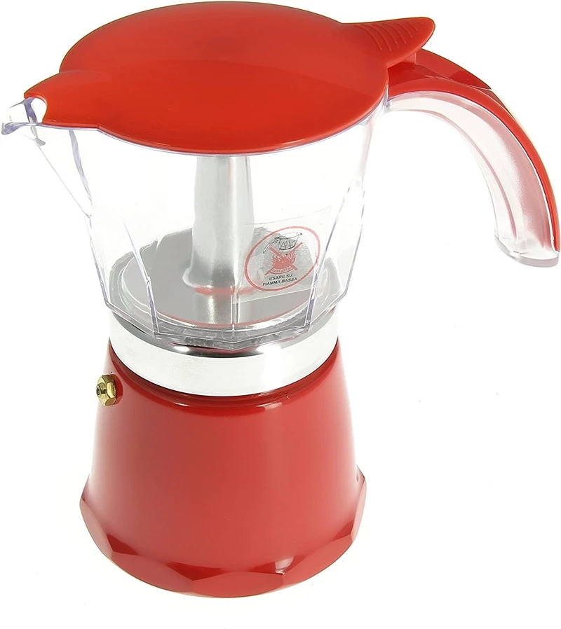 An elegant coffee pot for stove heating. Made from aluminium and MS (methyl methacrylate styrene). Makes 6 cups.