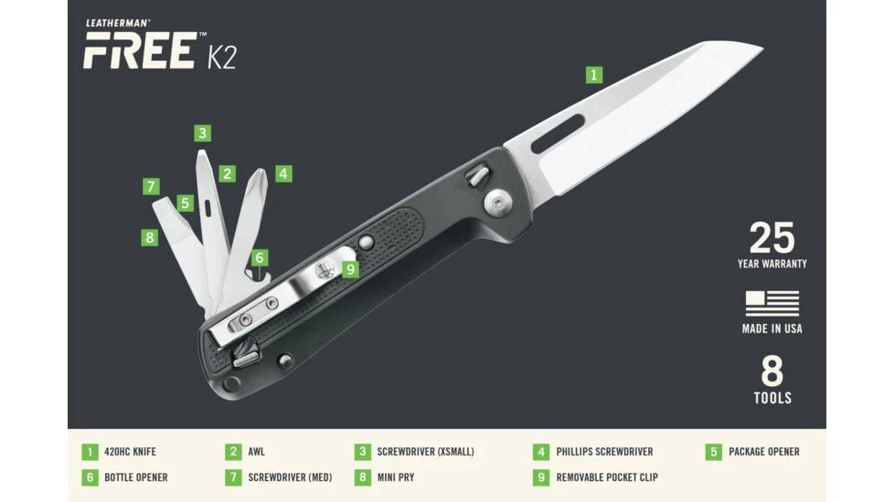 With a 3.3 inch blade and seven additional tools, including a pry tool and Phillips screwdriver, the K2 is multipurpose redefined. Each implement is housed on the outside of an ergonomically refined aluminum body for easy access, so youre never left fumbling in a pinch. Covered by our 25-year warranty.