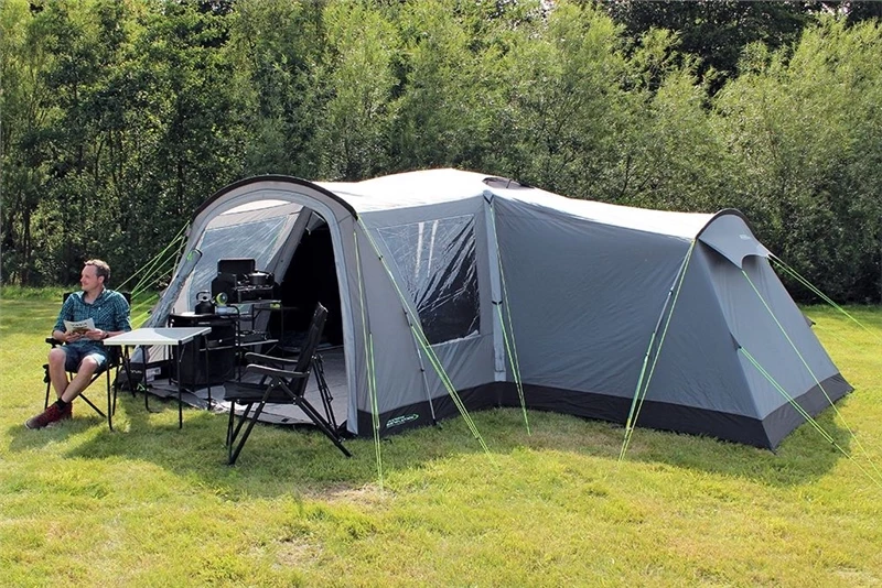 Introducing the Camp Star 1200, a vast yet lightweight family tent which represents incredible value for money. The frame of this twelve berth podded style tent is made up of both a welded central inflatable tube and 4 fibreglass poles, a hybrid which ensures both high performance and superb stability at a fantastic price point. We have afforded an ideal allocation of usable space for families and groups in this design, split between a generous commune area, and three darkened ‘Twilight’ 4-person bedrooms that can be split down to a 2/2 configured using the toggle in divider. Our bedroom ventilation system, a front mesh ventilation fly screen panel and crystal-clear window panels maintain an airy internal space and maximise airflow in warmer temperatures. There is an option to add a further Sun Canopy to the front of this tent to offer an ideal shaded area for relaxation, cooking, or dining. Outdoor Revolution understand that comfort has become a prerequisite for the modernized camper, which this tent comes complete with a Dura-tread Carpet and a Footprint Groundsheet, adding to the already outstanding value of this family tent.