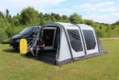 The Side Porch is pitched using two robust fibreglass poles, the weather-proof connection cowl is passed over the top of the tent and fits snugly over the contours of the air tubes, guy ropes are then pegged on the opposite side of the tent to secure the position.