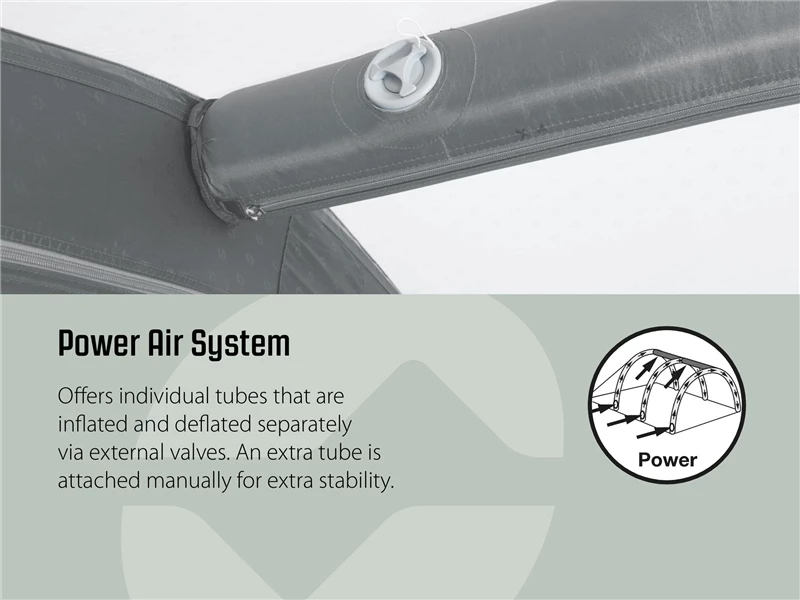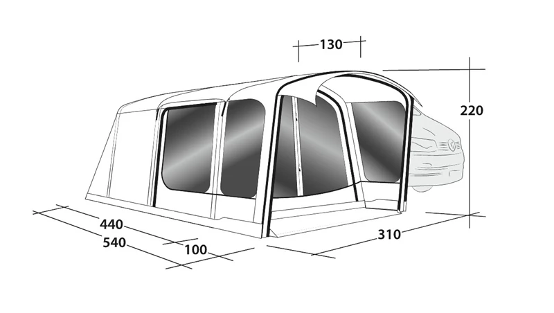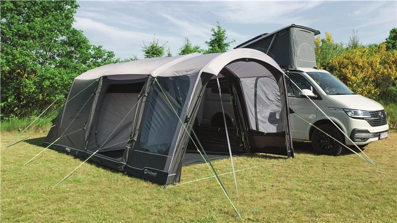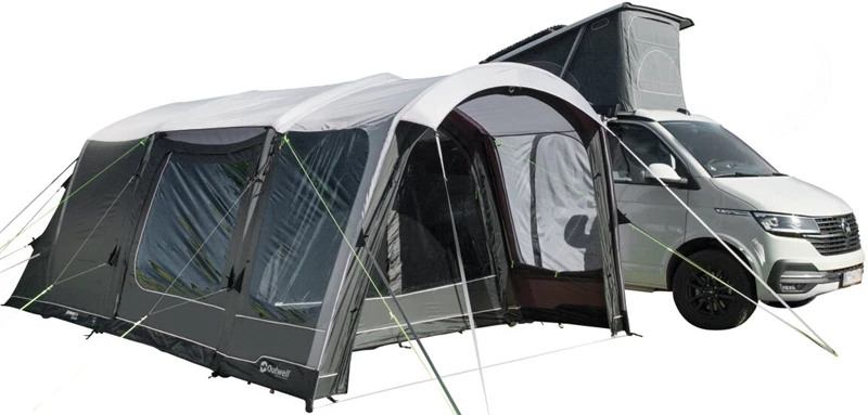 An outstanding choice for larger families, or when holidaying with friends. The inflatable Outwell Jonesville 440SA Flex drive-away awning is pitched parallel to either side of most campervans via its removeable access zone, there’s plenty of room for everybody to unpack, stretch out and relax in comfort under its durable, fully waterproof, ripstop fabric. With ample headroom and easy access, you certainly won’t be falling over each other on the campsite. Plus, you can enjoy more space in the van on days out as the awning can be left freestanding securely on your pitch. A large canopy over the movable front wall, with insect-proof mesh screen, offers either deep shelter for you to connect with the natural world or more enclosed living space for eating, playing games or just chilling out together. Prepared for the Outwell Nightlight System (patented) providing built-in lighting inside and outside the tent powered by optional ONS Light Unit Sets.