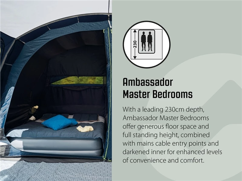 You’ll enjoy luxury camping with the Outwell Knoxville 7SA air tent. Featuring innovative Outtex 6000 RS Endurance fabric with superior tear strength and resistance to rips, this very large three-zone tent delivers plenty of space in both the living area and wet zone for comfortable tent living. Packed with innovative features for home from home comfort, it’s a great design for longer holidays. Sleeping seven in three superbly ventilated bedroom inners, it’s ideal for large families or camping with friends whilst the spacious, light-filled living area offers ample room for tent life, board games and dining. The large Panorama front ensures you stay connected with nature and the great outdoors.