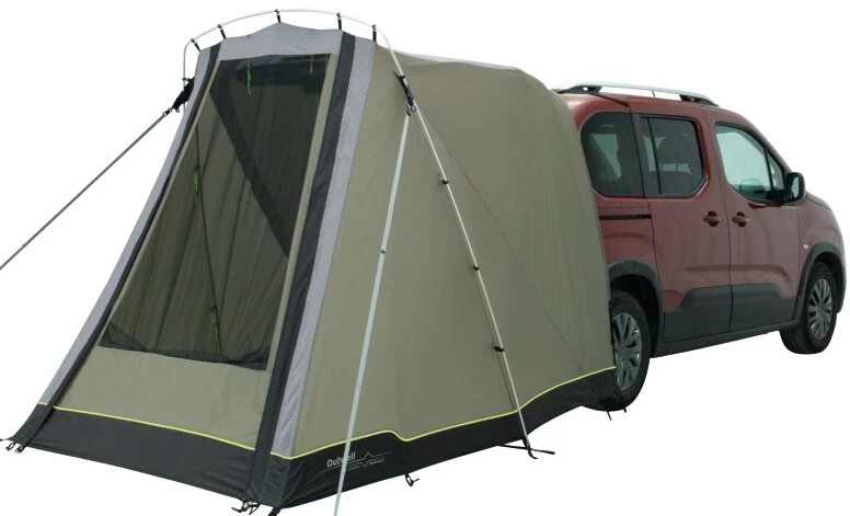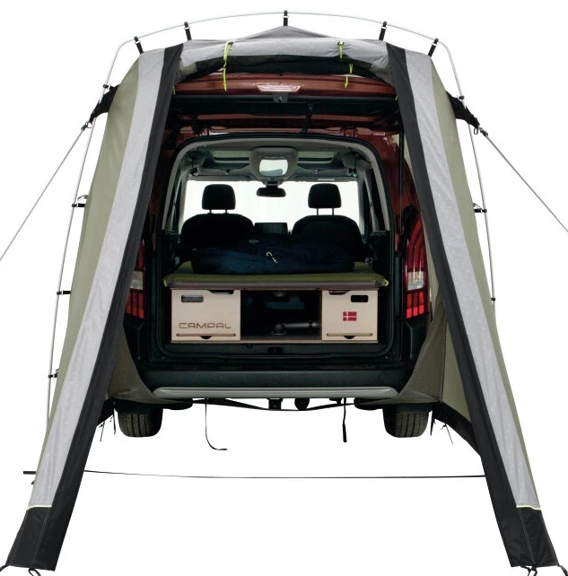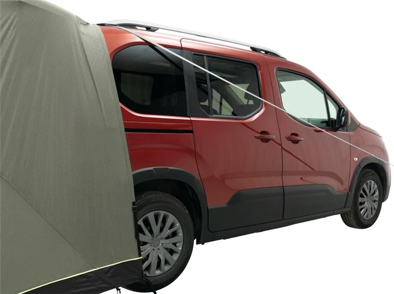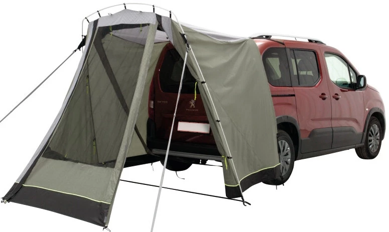 Light weight, small pack size plus easy and fast setup. As a rear-mounted, fixed awning, with just one aluminium pole, it´s really light, packs away small and vehicle doors aren’t blocked by guylines. It’s designed for vehicles like Peugeot Rifter, Citroen Berlingo, VW Caddy and the like. With easily adjustable height options, you’ll also find it ideal for smaller vehicles and SUV’s, perfect for camping and day trip use for cooking, as a day shelter or changing room. The smart design allows you to close and lock the tailgate securely when you head off on a hike or bike adventure or leave it open through the night whilst you secure your van rear with its insect-proof screen for great ventilation. As a bonus, you can raise the door as a shade canopy (poles not included) when fixing your bike or recharging your battery after your outdoor excursions.