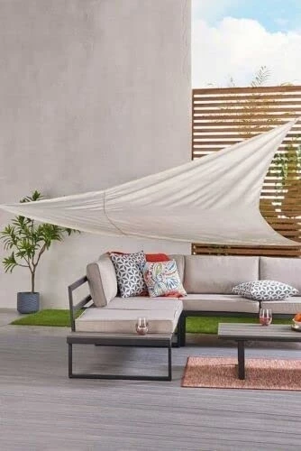 This triangular shade sail is manufactured with a D ring on each corner so that it can be secured to an anchor