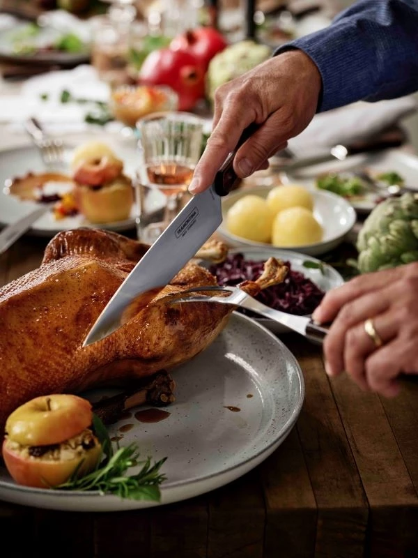 This 2 pc. Carving Set offers many outstanding features such as super-sharp serrated stainless-steel blades and distinctive stainless steel rivets which guarantee safety and security as well as a very characteristic appearance. Sculpted ergonomic handles are made from high quality polywood (real wood) from FSC certified forests which are dishwasher safe, impact and high temperature resistant.
