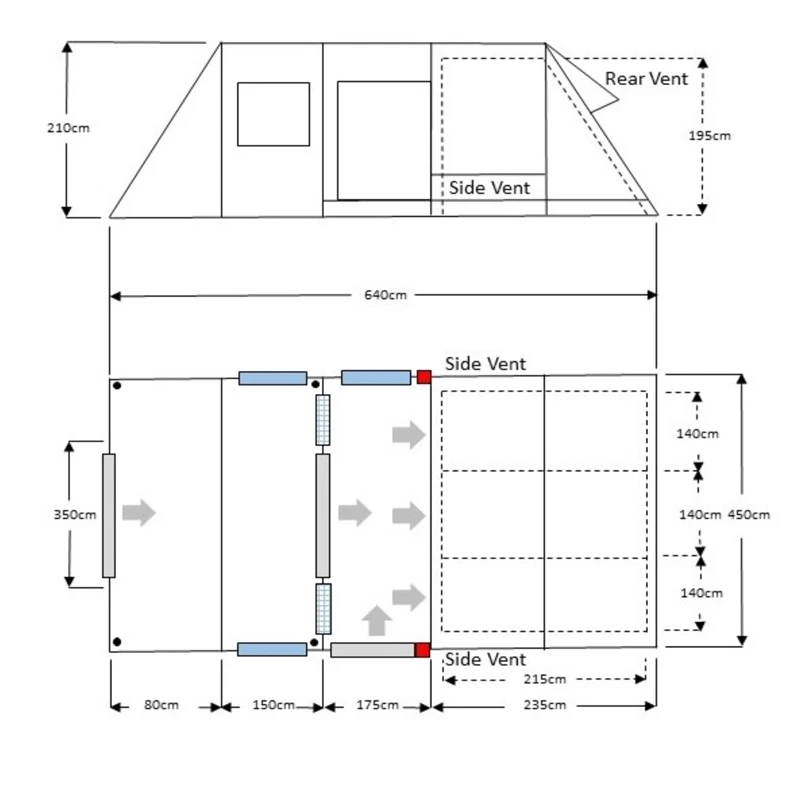 ► The light and airy living area has a fully sewn in main groundsheet to keep drafts and bugs away. Adjustable air vents with insect proof mesh panels are provided for comfort in warmer weather. The large tinted windows have adjustable privacy curtains and the bedroom section, which is made from a carefully selected black fabric, is divided into three compartments by way of removable partitions.