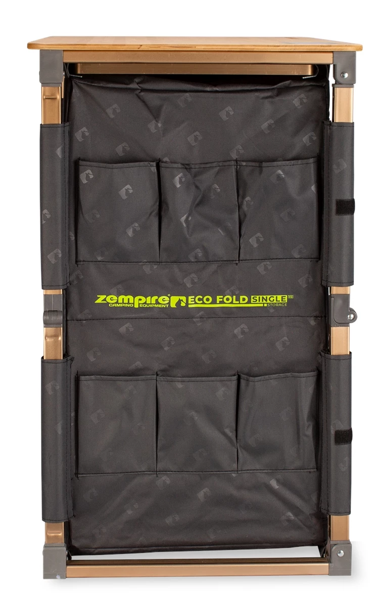 The Eco Fold Single V2 features a single zip-closed cupboard, a naturally weatherproof bamboo tabletop and a rustproof aluminium frame.