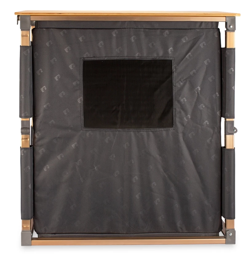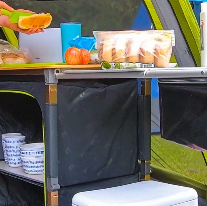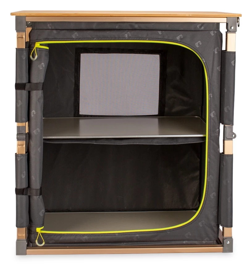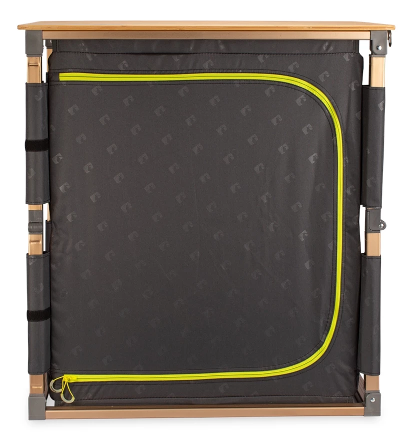 The Eco Fold Single V2 features a naturally weatherproof and heat-resistant bamboo tabletop and rustproof aluminium frame. A perfect working surface to cook and prepare camp meals. The zip-closed lower cupboard, along with side storage pockets, help to help keep your campsite organized. A retractable utility rack keeps utensils close at hand and can also store a basin for wash-up.